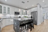 Color scheme consistency is a strategic approach where a single accent color is echoed throughout various elements of your home. Imagine gold: it’s not just a color but a statement. By integrating gold in lighting, faucets, and cabinet hardware, you create a cohesive narrative in your space. Combined with a neutral background color, the accents show like jewelry.